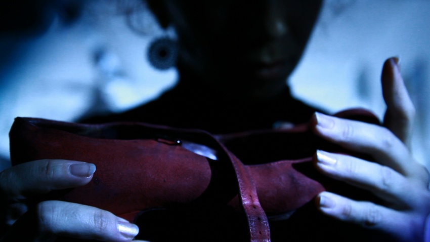 strange pair of red shoes. She decides to cross them to try again her dance steps.