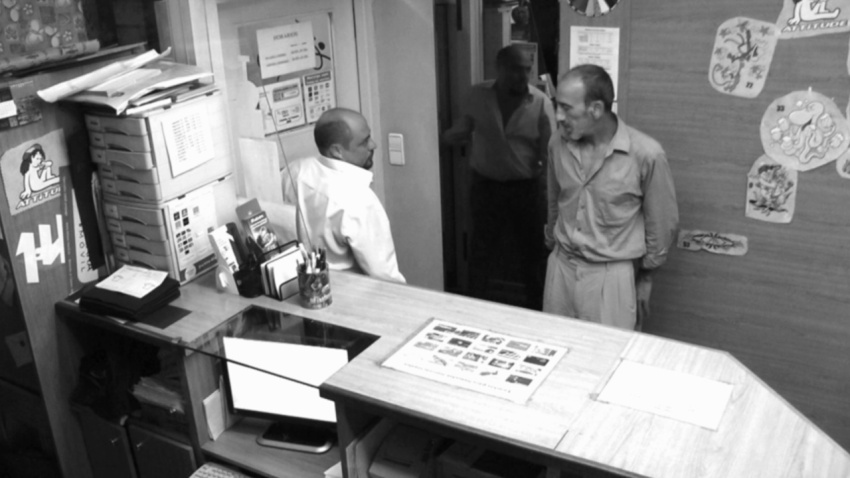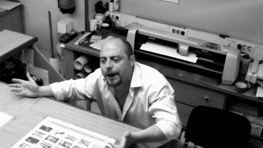 An immigrant, a refugee from war, living on the street, enters in a print shop. On a bad Castilian he attempts to explain to the clerk, an immigrant from Argentina, that he needs to do a sign to ask for money in the street.