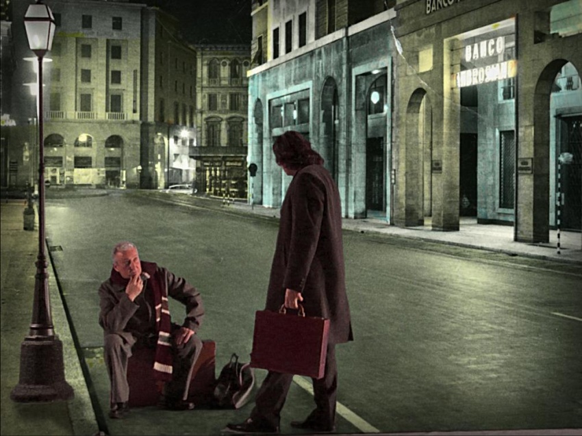 A comedy of Italian clichés: the opposite characters of an old Neapolitan man and a Milanese businessman clash on a train from Naples to Milan on Christmas Eve. In the background, the landscape is made of colourful, old-time postcards.