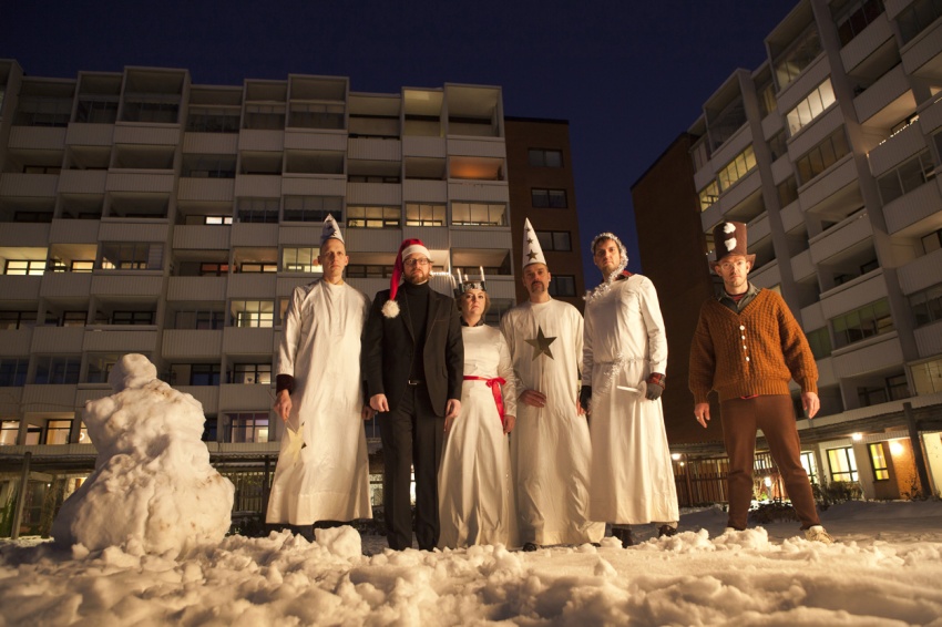 Seis bateristas vestidos para la tradicional procesión de Santa Lucia, entran en una casa de ancianos. En secreto tocan una composición musical con una máquina de coser y varios adornos de Navidad.