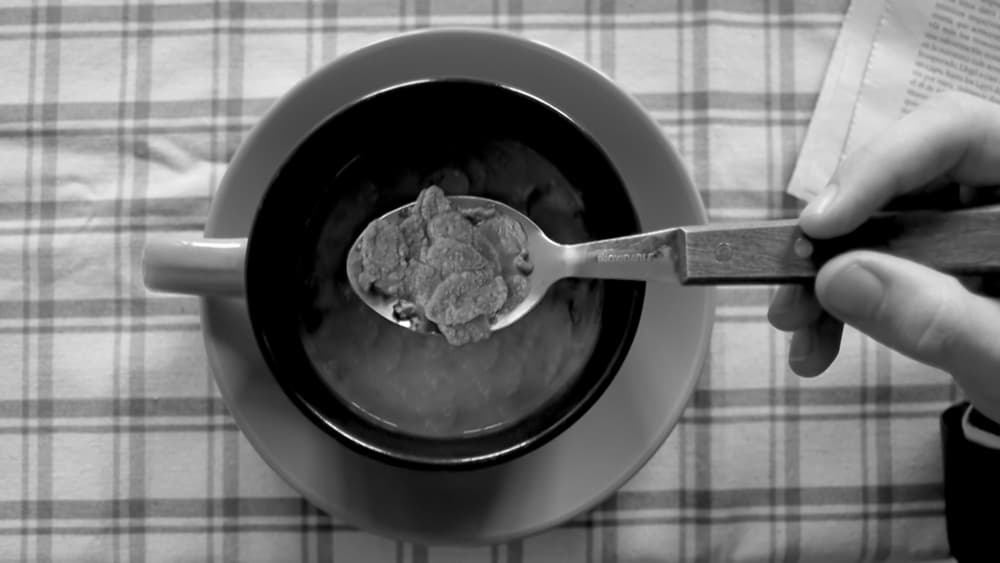 Un hombre solitario contempla su vida sentado inmóvil frente a su desayuno. Narración minimalista que envuelve el tiempo alrededor de sí misma.