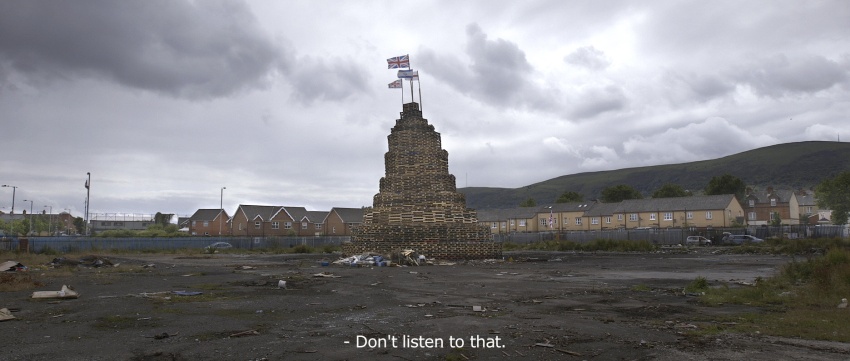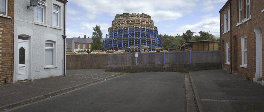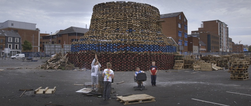 En Belfast la noche antes del 12 de julio - la celebración protestante anual - hogueras masivas se encienden en muchos vecindarios protestantes. Estas estructuras imponentes, construidas meses antes, se componen sobre todo de paletas de madera y neumáticos de coche con algunos que alcanzan más de 30 metros de altura.