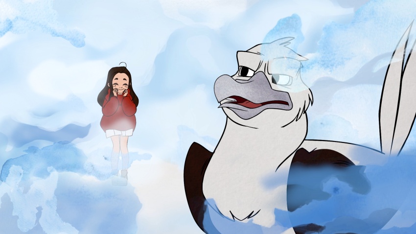Una chica aventurera huyendo de su padre preocupado, tropieza con un pájaro gruñón en una aleta sobre sus polluelos que vuelan el nido. En busca de aventuras, ella le sigue al misterioso y maravilloso mundo de las nubes.